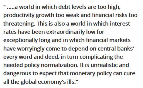 From the Bank of Int’l Settlements Qrtly report: “…a world in which debt levels are too high, productivity growth too weak and financial risks too threathening… It is unrealistic and dangerous to expect that monetary policy can cure all the global economy’s ills.”